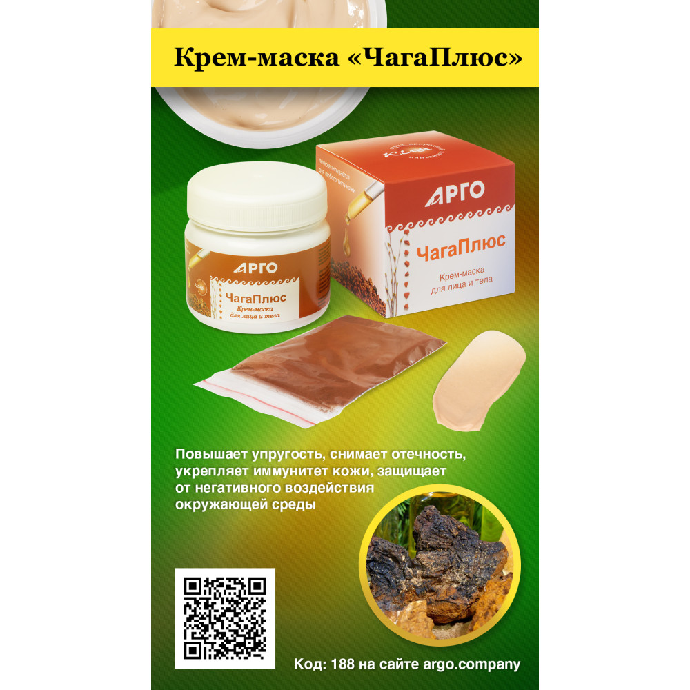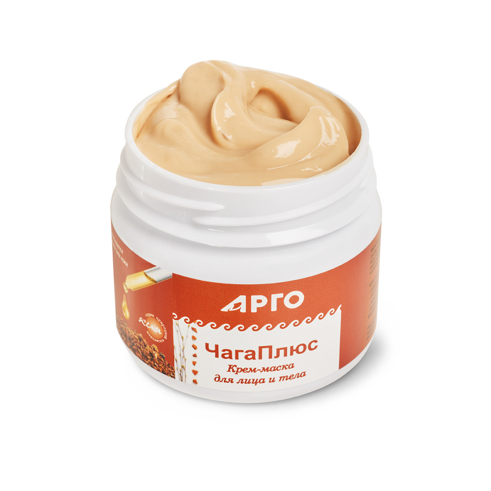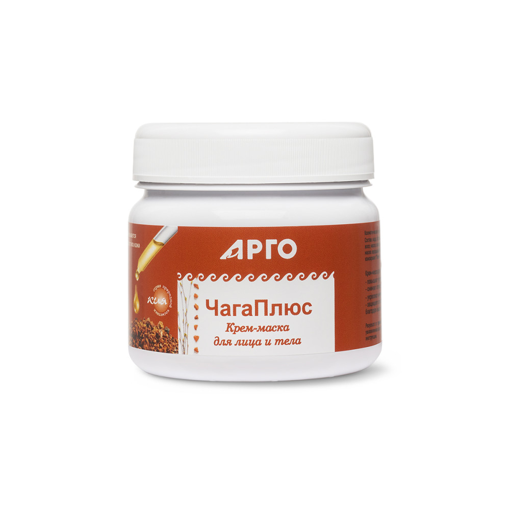 Повышает упругость, снимает отечность, укрепляет иммунитет кожи, защищает от негативного воздействия окружающей среды, благодаря высокому содержанию антиоксидантных компонентов. Полезные свойства гриба чага известны уже сотни веков. Настои с чагой использовались нашими предками не только для приема внутрь для оптимизации защитных сил организма, но и как средство для улучшения качества, обновления и защиты кожи. Экстракт чаги способствует восстановлению кожных покровов за счет своего уникального химического состава. Грибные полисахариды бета-глюканы обладают высокой антиоксидантной активностью. Под воздействием бета-глюканов и других биологически активных веществ чаги иммунная система выходит из состояния шока и начинает активно работать. Также бета-глюканы улучшают микроциркуляцию и помогают наилучшему проникновению активных компонентов крем-маски в глубокие слои кожи. Они же отвечают за регенерацию кожи и оказывают восстановительное воздействие на кожный покров. Бетулин – знаменитый тритерпеноид, еще один ценный компонент чаги, его основная задача в составе нашей крем-маски – защита кожи от различных факторов: перепадов температуры, ультрафиолетовых лучей, сухого кондиционированного воздуха. Свойства масляных компонентов нашего продукта позволяют создать эмульсию для оптимального контакта с липидами кожи, например, в масле конопли до 90% ненасыщенных жирных кислот, рекордно-высокое количество олеиновой и стеариновой кислоты, а также весь набор 3-6-9 Омеги. Чаще других коже не хватает именно незаменимых жирных кислот, они являются основой для клеток рогового слоя эпидермиса и входят в состав природной мантии дермы. В масле зародышей пшеницы огромное количество природного витамина Е, что также увеличивает антиоксидантный потенциал данной крем-маски, предупреждает старение, питает, регенерирует и восстанавливает кожу. Гиалуроновая кислота обеспечивает омолаживающее и антивозрастное действие, подтягивает и увлажняет кожу, уменьшает выраженность морщин, заломов. Эфирное масло герани – одно из самых эффективных в борьбе со старением кожи, обладающее тонким приятным ароматом.
