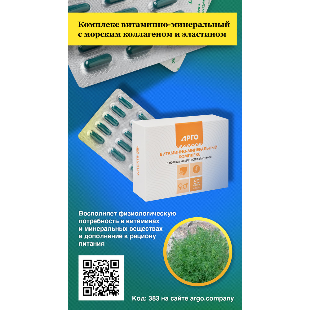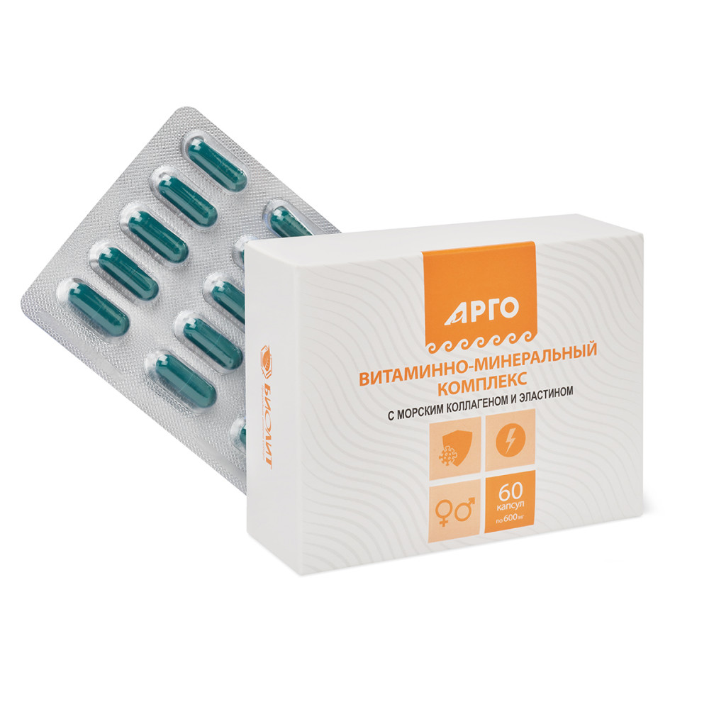 Витаминно-минеральный комплекс содержит комплекс эссенциальных (незаменимых) микро- и ультрамикроэлементов, необходимых для обеспечения нормальной жизнедеятельности организма, обладающих иммуномодулирующим, противовоспалительным и антиоксидантным действием. Витамины и микроэлементы стимулируют неспецифическую сопротивляемость организма вредным воздействиям, ускоряют восстановление тканей, уменьшают проницаемость сосудов, предотвращают развитие атеросклероза сосудов, восстанавливают клетки печени, стимулируют синтез белков и коллагена; восполняют энергетические ресурсы организма и повышают стрессоустойчивость, обеспечивают защиту от клеточного старения. Инозитол (витамин В8) регулирует жировой обмен, способствует снижению уровня холестерина в крови, улучает текучесть крови, препятствуя образованию тромбов, улучшает репродуктивные функции у женщин и мужчин, улучшает передачу нервных импульсов, обладает успокаивающим действием, стимулирует мозговую деятельность, улучшает концентрацию внимания и память. Холина битартрат (витамин В4) проявляет детоксикационные свойства, участвует в метаболизме жиров, повышая уровень ацетилхолина, способствует улучшению памяти. Аскорбат натрия (витамин С) обеспечивает синтез коллагена; участвует в формировании и поддержании структуры и функции хрящей, костей, зубов; влияет на образование гемоглобина, созревание эритроцитов. Железа бисглицинат, участвует в эритропоэзе, в составе гемоглобина обеспечивает транспорт кислорода в ткани. Комплекс плацентарного морского коллагена розового лосося V типа, гликопротеидов и эластина; Цитрат цинка способствуют увеличению синтеза собственного коллагена; регенерации и восстановлению организма; оказывают общеукрепляющее действие, улучшают состояние суставов, стимулируют рост и укрепление волос. Витамин Е (токоферола ацетат) обладает антиоксидантными свойствами, поддерживает стабильность эритроцитов, предупреждает гемолиз; оказывает положительное влияние на функции половых желез, нервной и мышечной ткани. Витамин В3/РР (никотиновая кислота) защищает клетки мозга, восстанавливает повреждения клеток, улучшает мозговое кровообращение. Стимулируя выработку нейротрансмиттеров дофамина, норэпинефрина и серотонина, улучшает когнитивные функции. Селенометионин – антиоксидант, борется со свободными радикалами, предупреждая повреждение клеточных мембран. Витамин А (ретинола ацетат) обеспечивает нормальную функцию кожи, слизистых оболочек, органов зрения. Витамин В5 (пантотенат кальция) – нутриент, способный синтезировать кишечный микробиом. Принимает участие в выработке гемоглобина и нейромедиаторов. Улучшает концентрацию внимания, слух и зрение; уменьшает тревожность. Витамин Д3 (холекальциферол), является регулятором кальциево-фосфорного обмена в организме, препятствует развитию остеомаляции и остеопороза. Витамин В6 (пиридоксаль-5-фосфат моногидрат) способствует поддержанию структуры и функции костей, зубов, десен, оказывает влияние на эритропоэз. Йодказеин – участвует в функционировании щитовидной железы, обеспечивает образование ее гормонов – тироксина и трийодтиронина. Витамин В2 (рибофлавин) – важнейший катализатор процессов клеточного дыхания и зрительного восприятия. Витамин В1 (тиамин гидрохлорид) в качеств