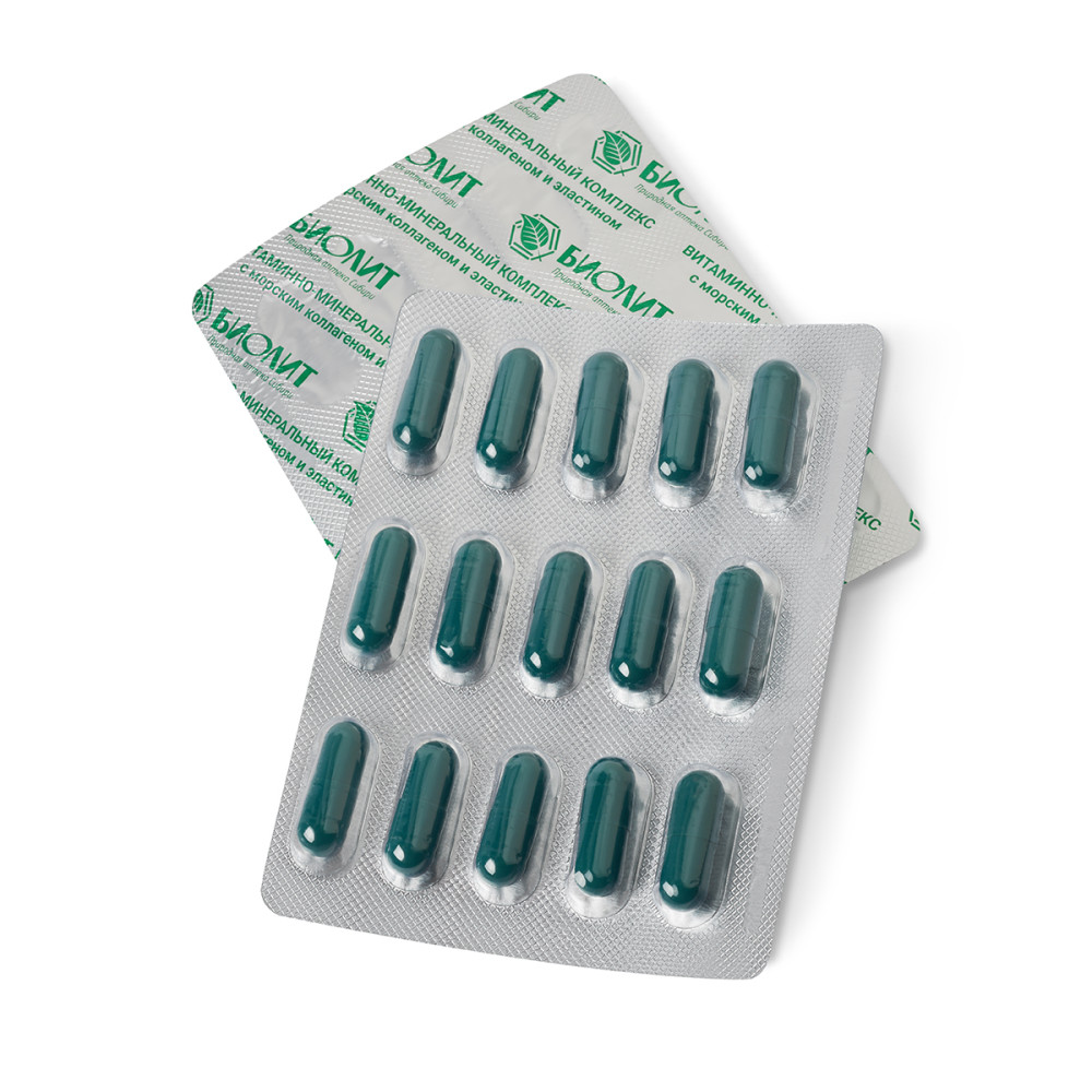 | Состав | Инозитол (витамин В8), холина битартрат (витамин В4), аскорбат натрия (витамин С), экстракт концентрированный сухой травы солянки холмовой (Salsola collina Pall.), железа бисглицинат, мука растительная (мука из длиннозерного белого риса), цинк цитрат, комплекс плацентарного морского коллагена розового лосося V типа, гликопротеидов и эластина, витамин Е (токоферол ацетат), витамин В3/РР (никотиновая кислота), селенометионин, стеарат кальция, витамина А (ретинол ацетат), витамин В5 (пантотенат кальция), витамин Д3 (холекальциферол), витамин В6 (пиридоксаль-5-фосфат моногидрат), йодказеин, витамин В2 (рибофлавин), витамин В1 (тиамин гидрохлорид), витамин В9 (L-метилфолат кальция) фолиевая кислота, пиколинат хрома, витамин В7/Н (биотин), витамин В12 (метилкобаламин). |