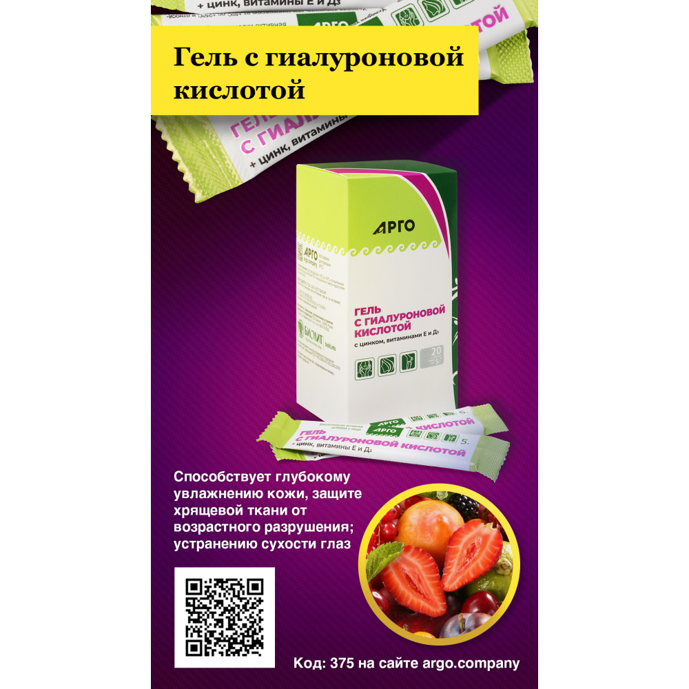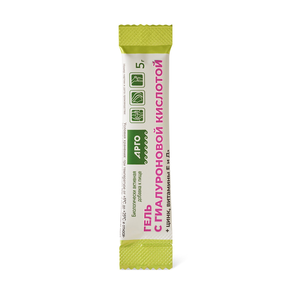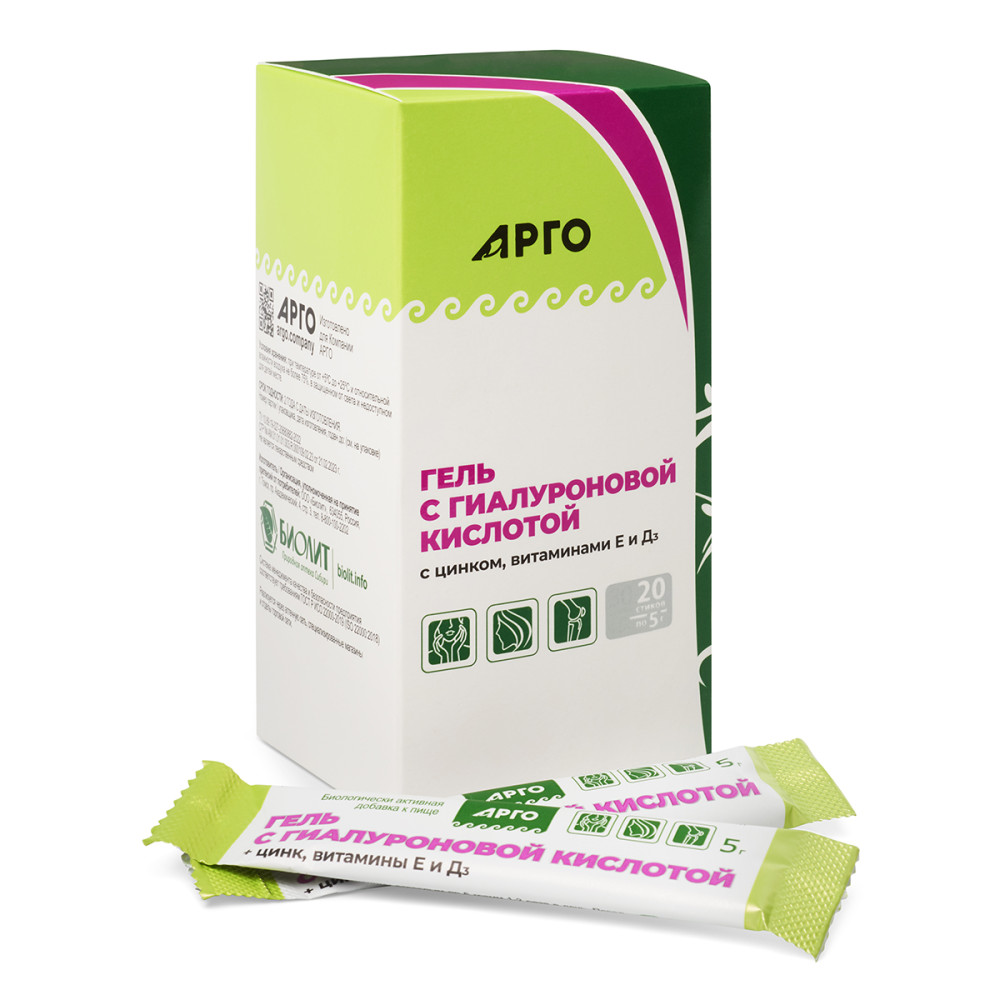 Гель представляет собой инновационный комплекс, содержащий 100% от суточной потребности гиалуроновой кислоты, цинка, витаминов Е и Д3. Способствует глубокому увлажнению кожи, улучшению ее тонуса и упругости, замедлению процесса формирования морщин и старения кожи; защите от фотостарения; сохранению подвижности и гибкости суставов, защите хрящевой ткани от возрастного разрушения; устранению сухости глаз; повышению эффективности наружных уходовых средств при совместном применении. Гиалуроновая кислота обеспечивает упругость и нормальное функционирование тканей за счет удерживания молекул воды и их связывания в межклеточном пространстве, поддерживая водный баланс организма. Способствует постоянной увлажненности кожи, предотвращению возрастных изменений, сокращению морщин. Гиалуроновая кислота является главным элементом внутрисуставной синовиальной жидкости, переносит питательные вещества, устраняет трение между суставными поверхностями, обеспечивая подвижность и нормальное функционирование суставов. Цинка цитрат принимает участие в синтезе коллагеновых волокон – строительных элементов дермы, отвечает за упругость кожи, способствует регенерации, ускоряя ее восстановление и обновление, улучшает рост волос. Витамин Е (токоферол) – сильный антиоксидант, повышает эластичность и тургор кожи, предупреждая появление морщин, нормализует работу сальных желез, защищает от вредного ультрафиолетового излучения и повреждения свободными радикалами. Витамин Д3 (холекальциферол) защищает клетки кожи от гибели во время стресса, стимулирует выработку пептидов-антибиотиков, предотвращающих воспалительные процессы, нормализует водный обмен в коже; укрепляет волосы, предотвращает их выпадение; замедляет процессы старения.