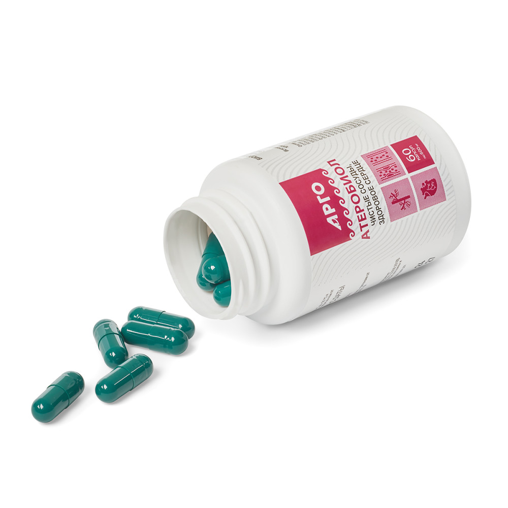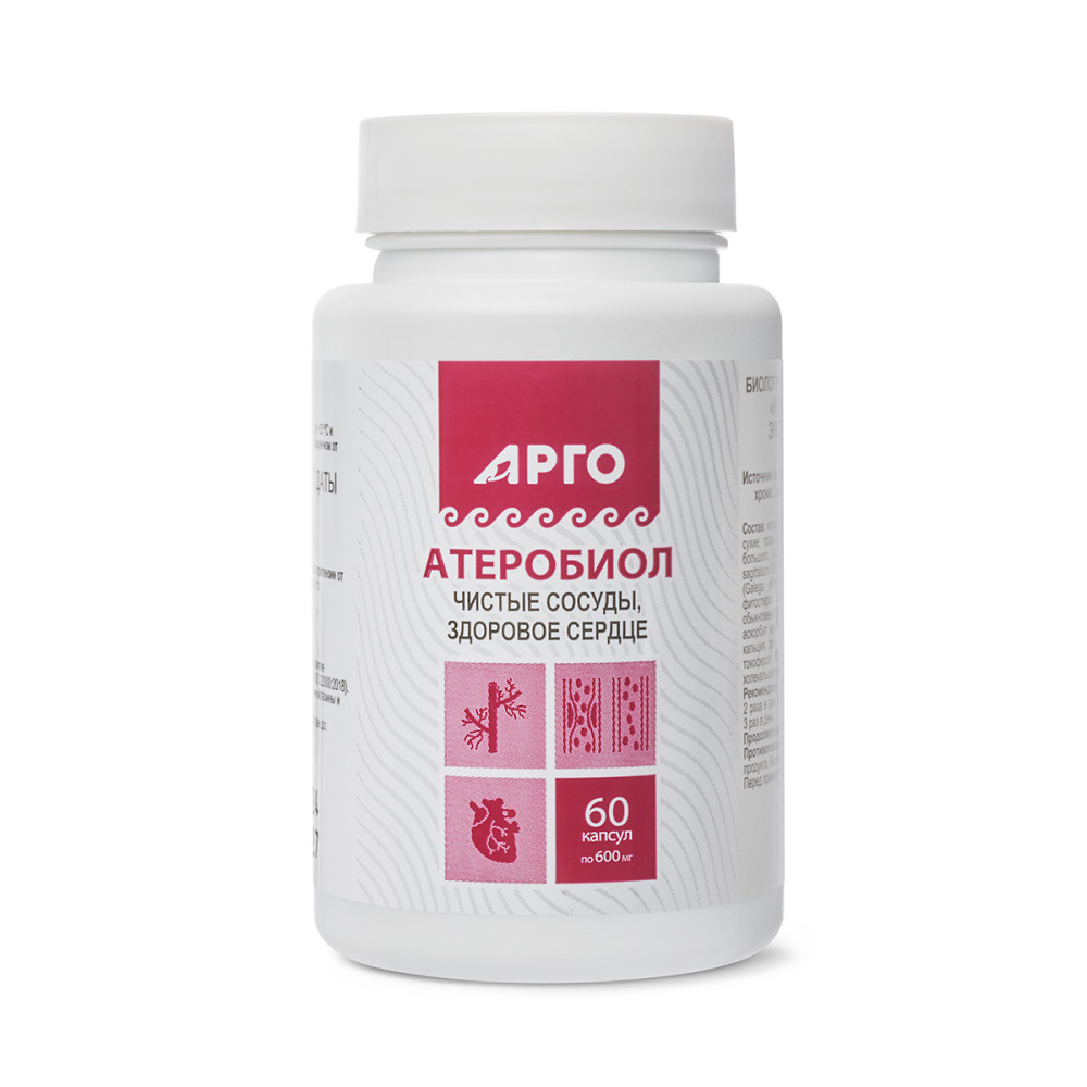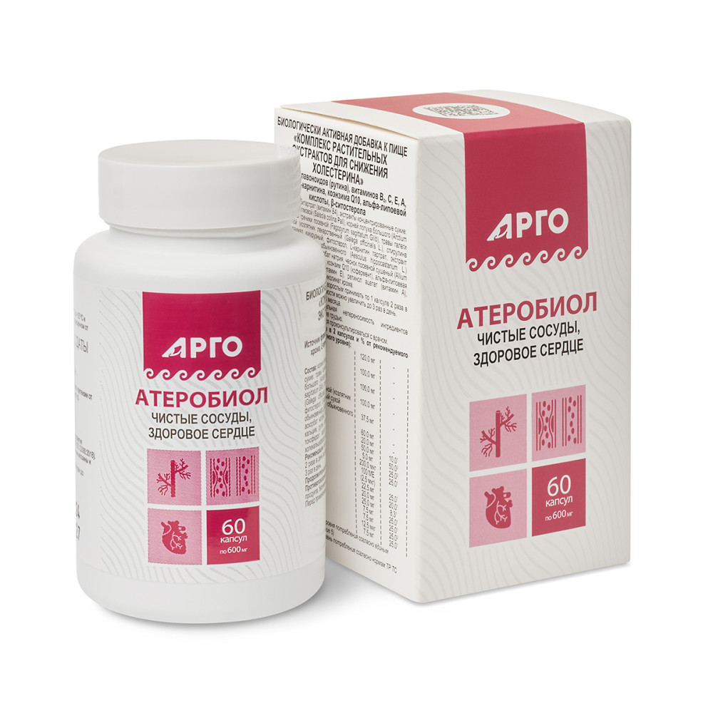 «Атеробиол» – средство растительного происхождения для нормализации липидного спектра крови, снижения окисленных форм липидов, улучшения антиоксидантной защиты. Содержит комплекс растительных экстрактов, фитостерол, холин, витамины, минералы, антиоксиданты. Способствует снижению риска развития атеросклероза; улучшает холестериновый и углеводный обмен; нормализует работу сердечно-сосудистой системы: улучшает микроциркуляцию, уменьшает проницаемость капилляров, укрепляет сосудистую стенку, оказывает антиоксидантное действие, предупреждает развитие воспалительных реакций.  Фитостеролы комплекса (β-ситостерол) – липидоподобные соединения растительного происхождения. По своей структуре они сходны с холестерином и успешно конкурируют с ним за всасывание в кишечнике, снижая тем самым поступление холестерина в кровоток. Фитостеролы снижают уровень холестерина низкой плотности (ЛПНП), установленного фактора риска развития ишемической болезни сердца (ИБС); обладают антиоксидантным, иммуномодулирующим и противомикробным действием, уменьшают негативное влияние окислительного стресса на организм. Антиоксиданты комплекса: коэнзим Q10 (кофермент), L-карнитин, альфа-липоевая кислота, спирулина — участвуют в образовании энергии клетки, нейтрализуют свободные радикалы, обеспечивают нормальное течение иммунологических реакций в организме, защищают организм от окислительного стресса. Антиоксиданты способствуют нормализации артериального давления, укрепляют сердечную мышцу, снижают риск развития инфаркта, защищают и поддерживают стабильную работу сердца, в т. ч. при интенсивных нагрузках; повышают работоспособность и физическую выносливость, тормозят процессы старения.  Экстракты травы солянки холмовой, корней лопуха большого, травы гречихи посевной, травы галеги лекарственной очищают кровь от токсинов, улучшают коронарное кровообращение, состояние стенок сосудов и капилляров; восстанавливают кишечную микробиоту; нормализуют функции печени и обмен веществ, оказывают антиоксидантное, иммуномодулирующее и противоопухолевое действие.  Чеснок посевной стимулирует кроветворение, проявляет антигипоксический и ангиопротекторный эффекты; обладает антимикробными, противовирусными, противогрибковыми, желчегонными, гипохолестеринемическими, гипогликемическими и противовоспалительными свойствами.  Витамины А, В, С, Е, Д3 в составе комплекса обладают иммуномодулирующим, противовоспалительным и антиоксидантным действием, стимулируют неспецифическую сопротивляемость организма вредным воздействиям, ускоряют восстановление тканей, уменьшают проницаемость сосудов, предотвращают развитие атеросклероза сосудов, восстанавливают клетки печени, стимулируют синтез белков и коллагена. Все составляющие продукта усиливают действие друг друга, оказывая синергетический эффект.
