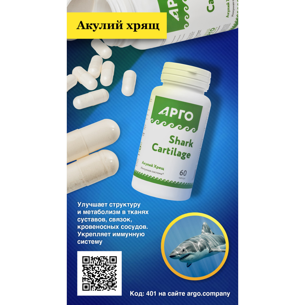 Акулий хрящ улучшает структуру и метаболизм в тканях суставов, связок, кровеносных сосудов; в хрящевой ткани. Обладает противовоспалительными свойствами, укрепляет иммунную систему организма, оказывает общеукрепляющее действие.