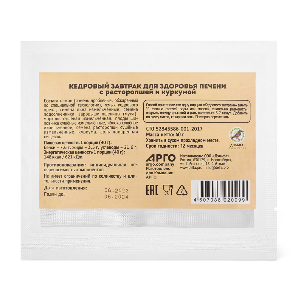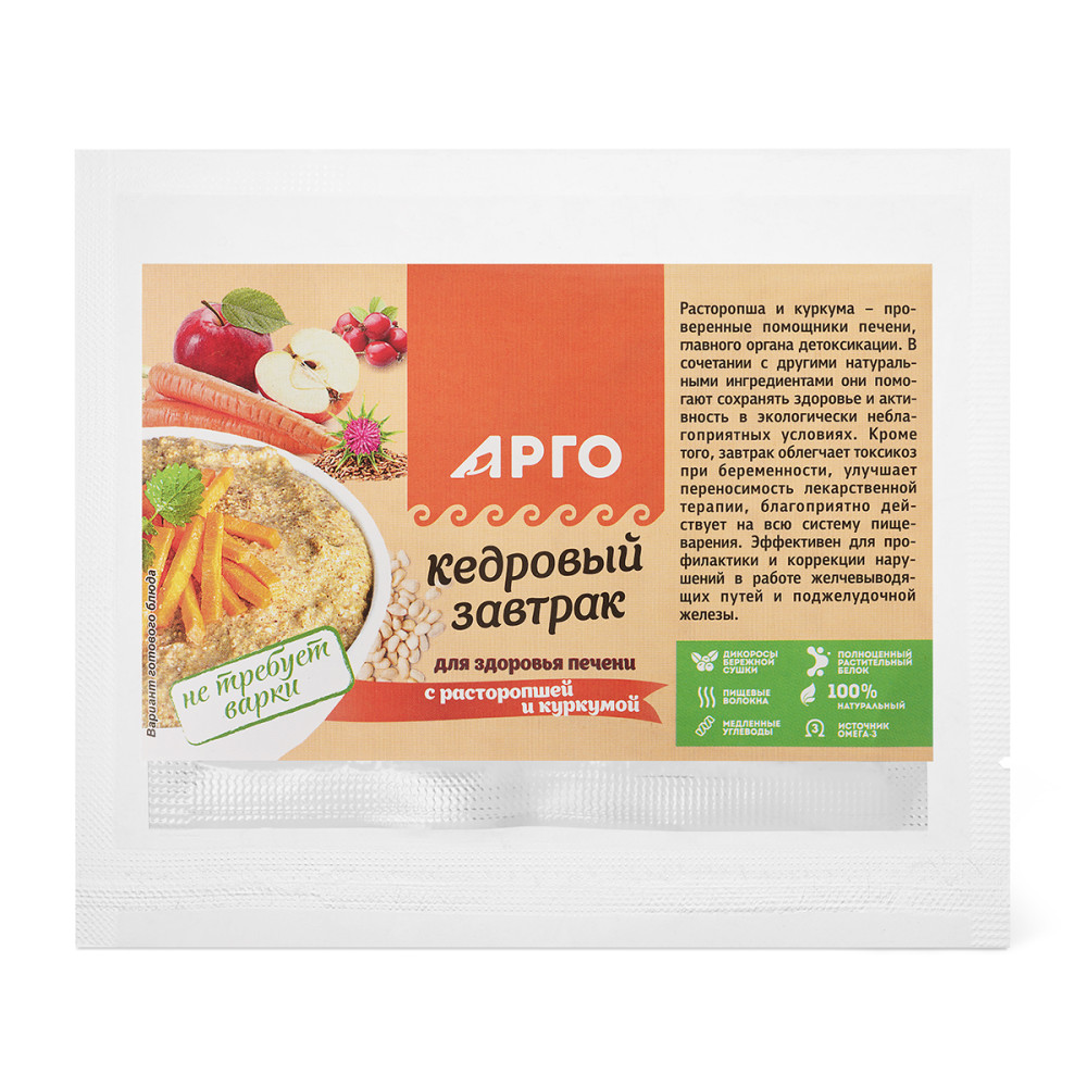 Способ приготовления: одну порцию «Кедрового завтрака» залейте ½ стакана горячей воды, размешайте и оставьте на 3-5 минут. По вкусу добавьте к блюду масло, молоко, сахар или соль. «Кедровый завтрак» можно залить холодным молоком, йогуртом или кефиром. В этом случае рекомендуется оставить его на 10–15 минут перед употреблением.