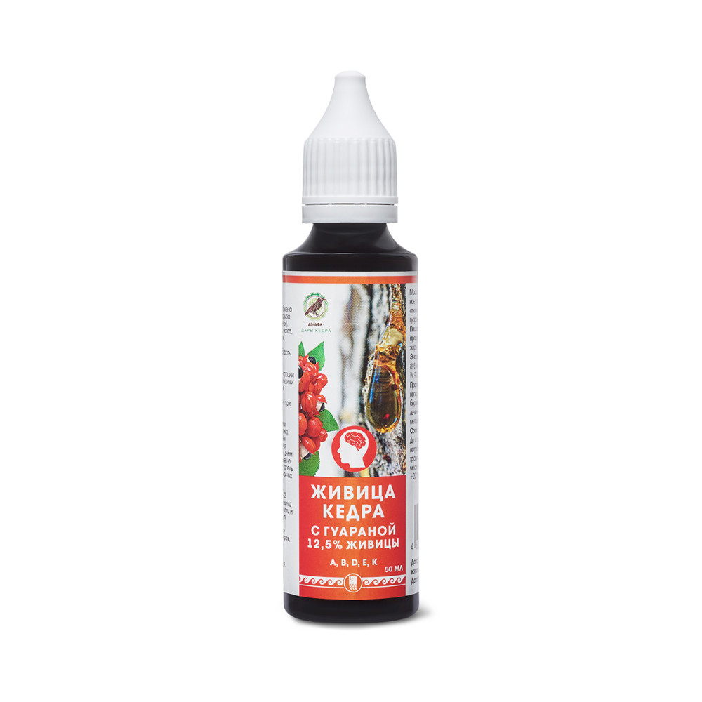 Объединяет в себе оздоровительное действие живицы кедра и экстракта гуараны, способствует улучшению всех видов обмена веществ, активизации липолиза (расщепления жировых клеток), повышению физической и умственной работоспособности, устойчивости к стрессу, помогает оптимизировать работу сердечно-сосудистой, иммунной и нервной систем, головного мозга.  Живица кедра в кедровом масле 12,5% обладает выраженным бактерицидным, ранозаживляющим, противовоспалительным, противоязвенным, иммуномодулирующим, антиоксидантным, антимутагенным, противоопухолевым, адаптогенным, антисклеротическим, нейропротекторным действием.  При приеме внутрь живица кедра в кедровом масле:  • способствует нормализации работы пищеварительной системы, восстановлению слизистой оболочки ЖКТ при наличии воспалительных и дегенеративных процессов;  • оказывает благоприятное воздействие на функциональное состояние эндокринной системы, работу щитовидной и поджелудочной желез; • активизирует регенерацию здоровых клеток, стабилизирует и восстанавливает клеточные мембраны, улучшая метаболизм во всех органах и тканях;  • улучшает реологические свойства и липидный спектр крови, снижая риск развития атеросклероза и сердечно-сосудистых заболеваний (ишемической болезни сердца, стенокардии, инфаркта миокарда, сердечной недостаточности, инсульта);  • способствует улучшению состояния центральной нервной системы, кровообращения и обменных процессов в головном мозге, повышению умственной работоспособности и устойчивости к стрессу;  • проявляет положительный эффект при кожных заболеваниях (угревой сыпи, экземах, дерматитах, псориазе, нейродермите). Включение живицы кедра в комплексную терапию дерматологических заболеваний в качестве одновременно наружного и внутреннего средства, способствует облегчению симптомов и устранению причин заболевания, связанных с нарушением работы эндокринной и нервной систем, желудочно-кишечного тракта.  Гуарана – растительный тоник, в состав плодов которого входит гуаранин, оказывающий тонизирующее и стимулирующее действие.  В отличие от кофеина, гуаранин не обладает агрессивными свойствами, мягко и постепенно усваивается, способствуя повышению работоспособности и улучшению обмена веществ на протяжении более длительного времени.