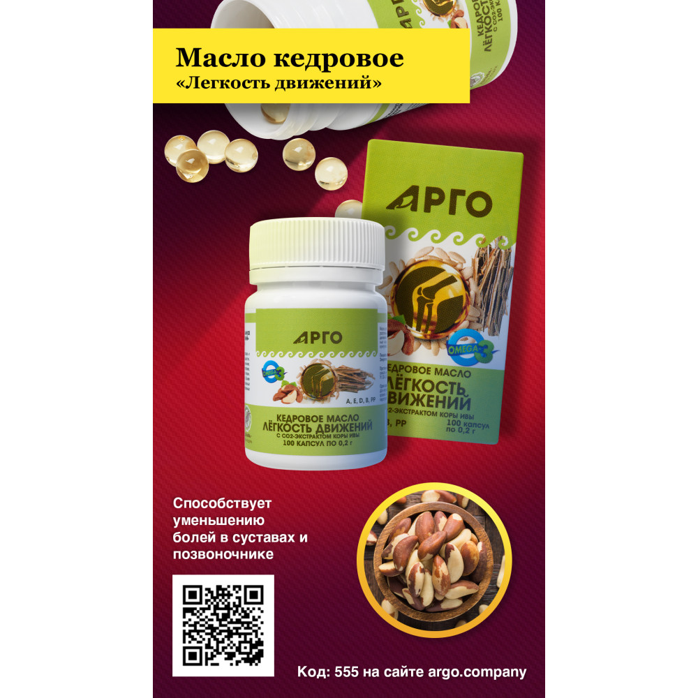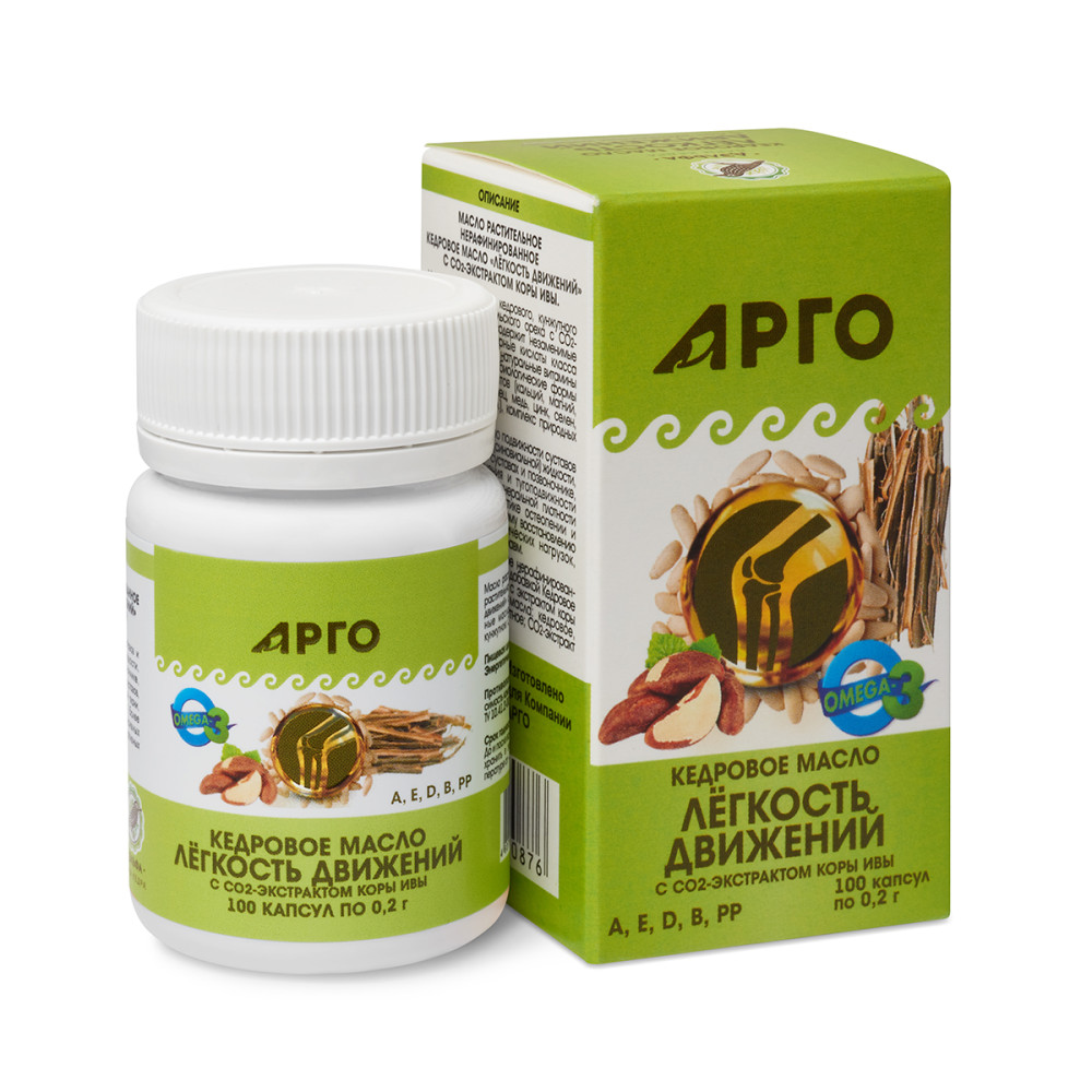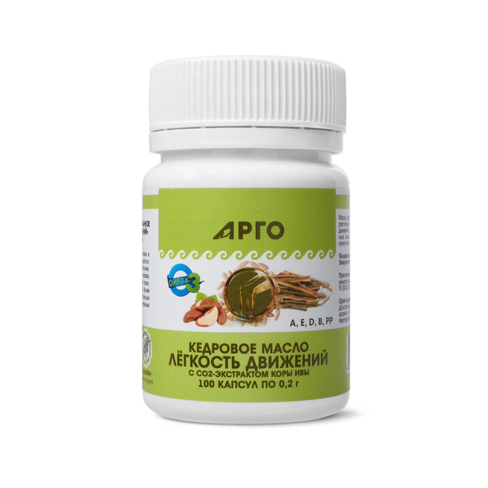 Кедровое масло «Лёгкость движений» с экстрактом коры ивы содержит: - незаменимые полиненасыщенные жирные кислоты класса омега-3, фосфолипиды и стерины; - натуральные жирорастворимые витамины А, Е, D, водорастворимые витамины – группы В, РР; - биологические формы микро- и макроэлементов: кальций, магний, фосфор, сера, марганец, медь, цинк, селен, йод, бор, кремний и др.; - аминокислоты, в том числе незаменимые (метионин, лизин, пролин и другие). СО2-экстракт ивы содержит комплекс природных салицилатов, который в отличие от аспирина (ацетилсалициловой кислоты) не приводит к раздражению и изъязвлению слизистой оболочки желудка и кишечника, так как в иве салицилаты связаны с полисахаридами, тритерпенами, флавоноидами, иридоидами, органическими кислотами, дубильными веществами, защищающими слизистую оболочку желудочно-кишечного тракта. Экстракт коры ивы обладает детоксикационным, мягким мочегонным и желчегонным действиями, уменьшает боль в суставах, проявляет мягкий успокаивающий и антистрессовый эффект, улучшает текучесть крови, уменьшает вероятность образования тромбов в сосудах. Кедровое масло «Лёгкость движений» с экстрактом коры ивы способствует: