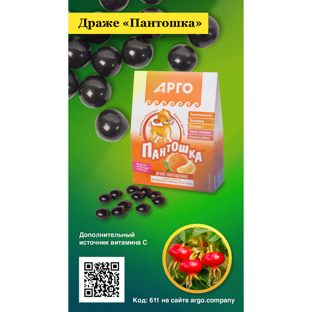 Предназначено для активно растущих детей, обладает способностью улучшать процессы обучаемости и памяти (смысловой и механической), нормализует работу иммунной системы, обладает общеукрепляющим действием, уменьшает воспалительные процессы, повышает сопротивляемость организма к неблагоприятным условиям внешней среды. Рекомендуется в качестве обогащенного пищевого продукта, дополнительного источника витамина С. Пантогематоген положительно влияет на память, процессы мышления и обработки информации, повышает устойчивость к стрессам, нервным перегрузкам, переутомлению, повышает уровень защитных реакций организма за счет внутренних ресурсов. Витамин С – мощный антиоксидант. Способствует укреплению иммунитета, увеличивает устойчивость к инфекциям, является фактором защиты организма от последствий стресса. В иммунной системе витамин С является злейшим врагом всех возбудителей болезней, паразитов, вирусов, микробов и, в первую очередь, свободных радикалов. Ввиду высокой активности процессов роста, дети нуждаются в постоянном восполнении дефицита витаминов, макро- и микроэлементов, а так же в защите функциональных систем организма от возможной перегрузки. Учитывая это, в драже «Пантошка» введен комплекс плодово-ягодных экстрактов, повышающих сопротивляемость организма к простудным и инфекционным заболеваниям, обеспечивающих защиту стенок сосудов, гипофизадреналовой системы и иммунитета в целом. Экстракт рябины красной является природным поливитаминным комплексом, прекрасным общеукрепляющим средством. Богат антоцианами, флавоноидами, витаминами С, В3, Е, К, каротином, фолиевой кислотой. Поддерживает процессы регенерации тканей. Экстракт черной смородины содержит витамины С, B1, B3, каротин, калий, железо, лимонную, яблочную и другие органические кислоты, пектины, дубильные вещества. Повышает иммунитет и сопротивляемость организма различным заболеваниям. Экстракт шиповника способствует укреплению иммунитета, повышению сопротивляемости организма к воздействию бактерий; помогает оздоровлению пищеварительной системы. Содержит целый комплекс необходимых человеку минералов и витаминов, среди которых витамин С в самой высокой концентрации, каротин, рутин, железо, калий, фосфор, марганец, магний, а также антиоксиданты, дубильные вещества, фитонциды и органические кислоты.
